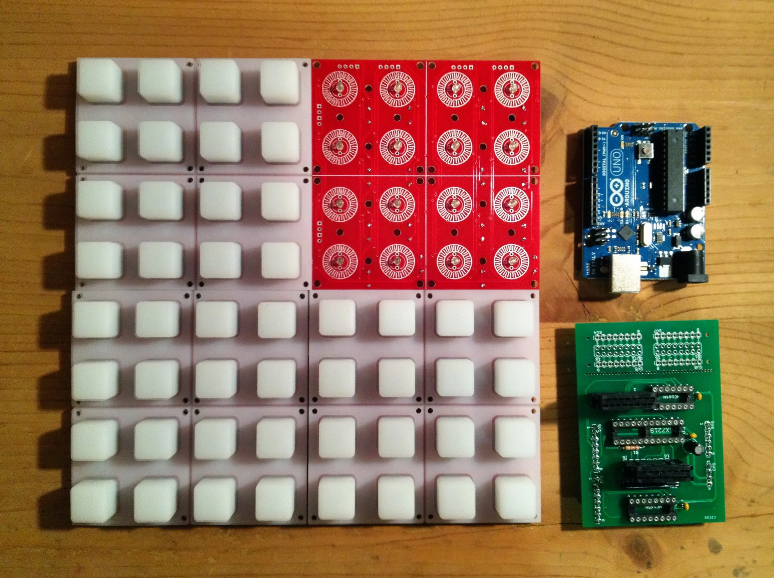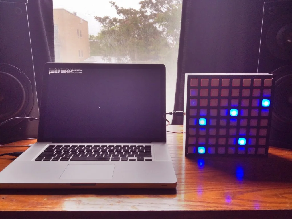 The concept of this project was to create a clone of the Monome using the open source Arduino platform. The Monome is an adaptable minimalist grid-based controller that was originally designed for creating and performing electronic music. The Monome is typically released in sizes varying from 64 to 256 buttons, plus a very small run of a 512 edition. Because Monome has embraced the open source movement, they have made the firmware for the controller available to the public to use, adapt, and share as they wish. This has enabled the firmware to be ported to the Arduino platform, for others to continue to produce, build upon, and contribute to the community. As a musician and composer, I have been interested in new musical interfaces, especially those that allow for electronic music production and performance. As an avid user of the audio production software Ableton Live, I originally gravitated towards the grid-based interface because it makes perfect sense in correspondence with the session/performance mode in Ableton. As I got deeper into computer music I began to gain a greater appreciation for modularity in interface arrangement and became interested in the ways that one can create their own musical setup using the graphical programming environment, Max/MSP. I also became aware of the Open Sound Control protocol (OSC) and the benefits it has over the current, but dated MIDI standard. Through searching for practical ways to take advantage of OSC for audio and interactive arts, this project enabled me to marry my interests into a cohesive interactive interface as I explored physical computing.